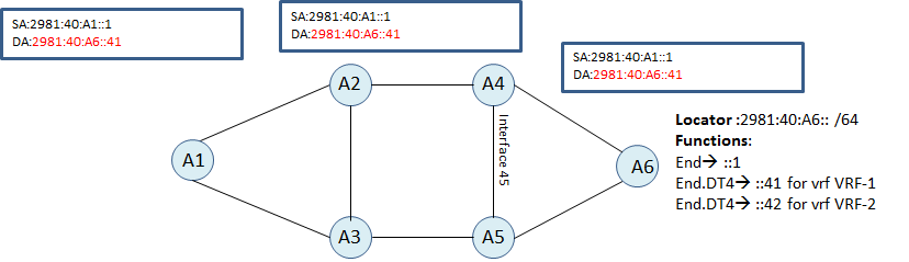 - Node A6 has the definition for ::41 function and it poinnts to the VRF-1. Node A6 will remove IPv6 header and will do routing lookup inside the VRF-1.